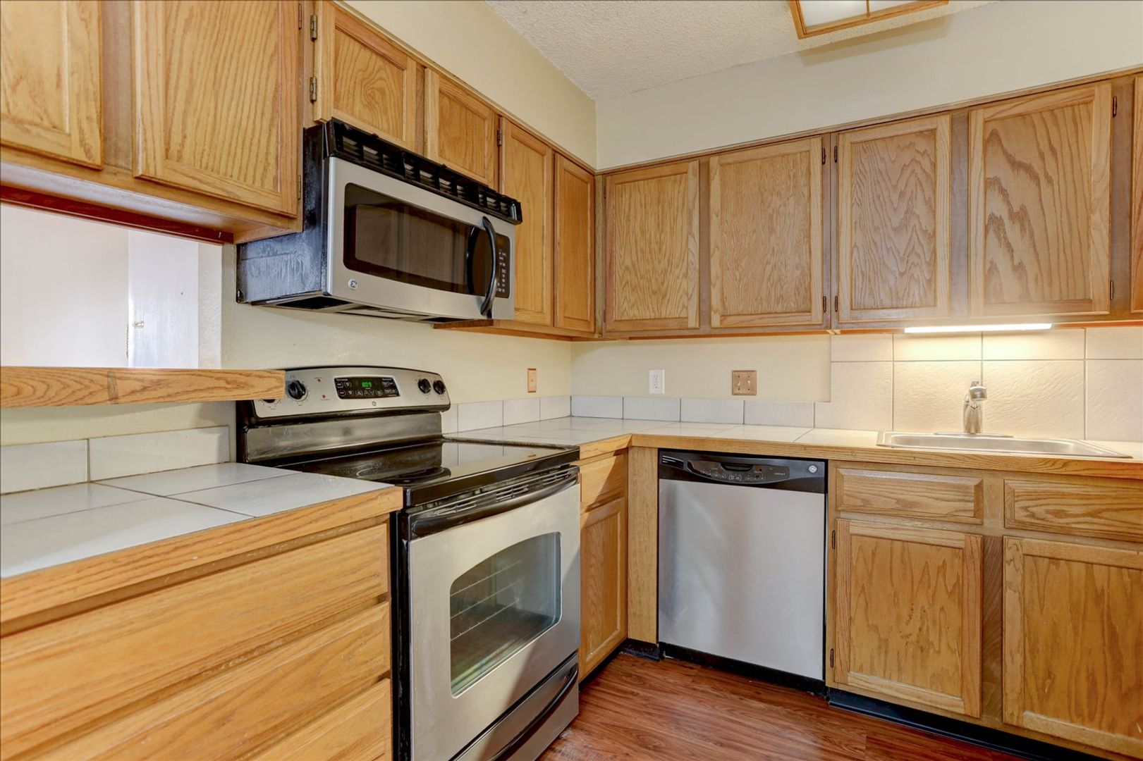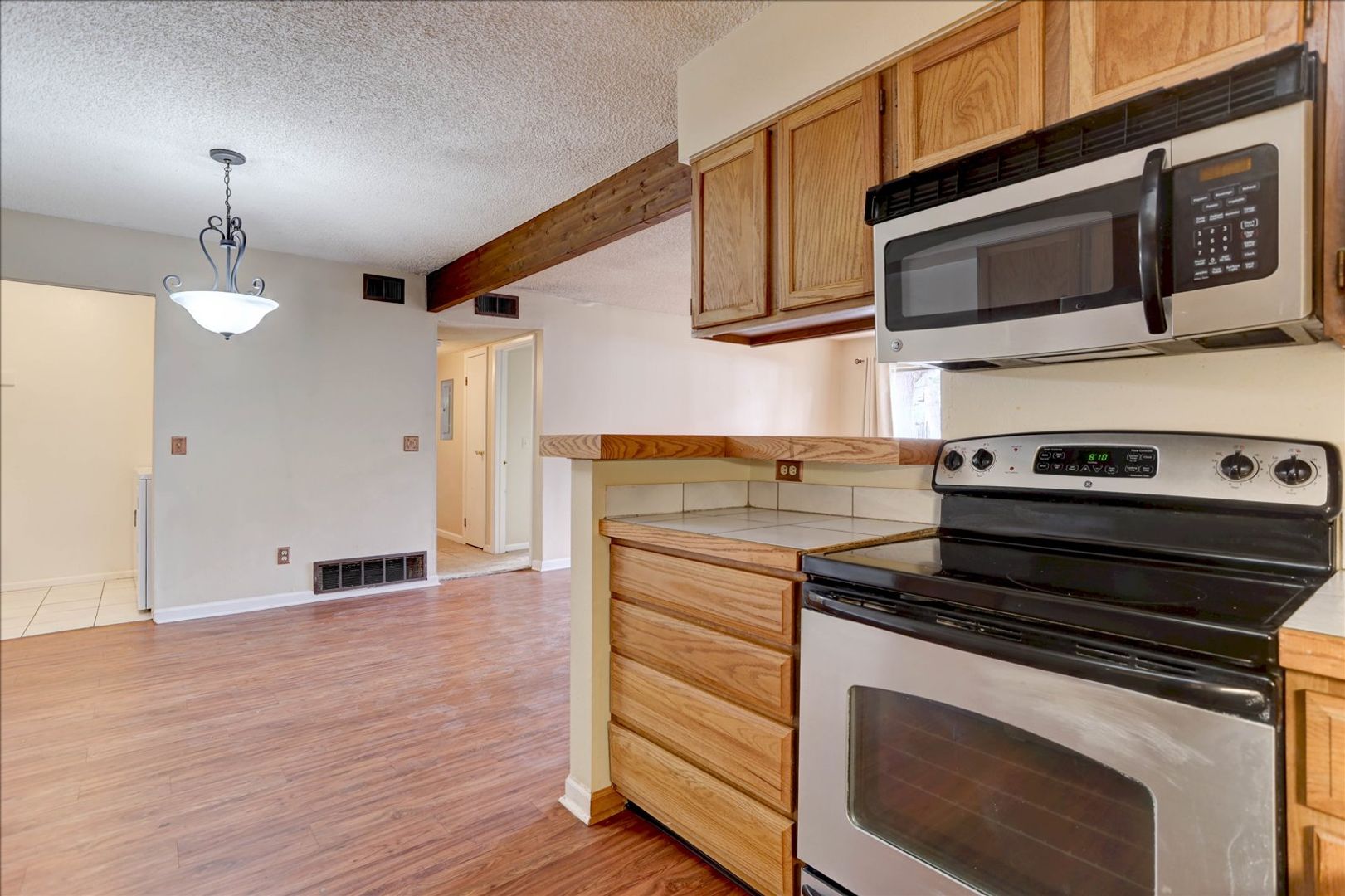 Step inside to a nice sized main living space with an abundant kitchen open to a dining room and family room with fireplace. The kitchen has tons of countertop and cabinet space and all appliances are included. Convenient laundry room with washer and dryer just off the dining space. The family room is spacious and offers easy access through a sliding glass door to a covered patio. Hard surface flooring throughout the kitchen, dining, and family room.